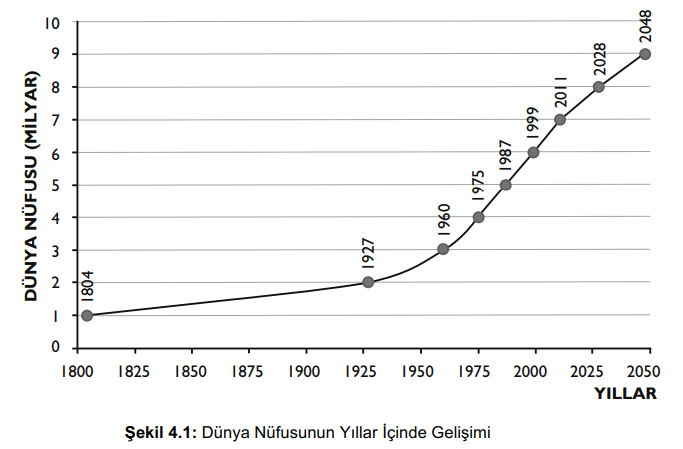 Şekilde, alt eksene yıllar, dikey eksene bir milyarlık dilimler halinde dünya nüfusu yerleştirilmiştir. Bu nedenle birer milyarlık artışların yılları, bütün olarak nüfusun hareketi hakkında bilgi üretmektedir. Grafiğe göre, Dünya nüfusunun birinci milyara ulaşması uzun bir zaman almıştır (1800 yıl). Fakat kendini katlaması sadece 130 yıl (1800'lerden 1920'lere) sürmüştür. Dünya nüfusu 1960’da üçüncü milyarı, 1975’de dördüncü milyarı görmüştür. Doğru cevap C'dir.