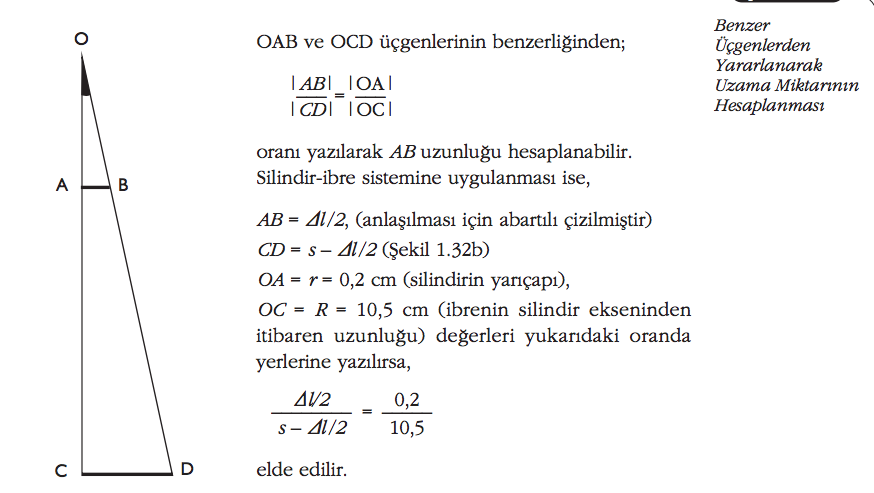 Benzer üçgenlerden yararlanarak uzama miktarının hesaplanması için yandaki OAB ve OCD üçgenlerinin benzerliği doğrultusunda;