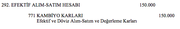 Yapılan yevmiye kaydında banka ay sonunda yaptığı evalüasyon sonucunda oluşan karın muhasebeleştirme işlemini 292. Efektif Alım-Satım Hesabını borçlandırarak ve 771. Kambiyo Karları Hesabını alacaklandırarak yapmıştır.