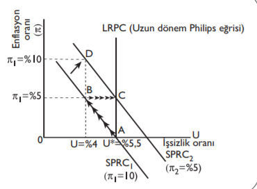 Fiyatların %5 artması enflasyon beklentilerinin ayarlandığı bir öğrenme süreci başlatır ve Philips eğrisi SRPC2’ye doğru kayar.