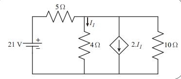 I1 ifadesi, düğüm denkleminde yazılarak denklem tek bilinmeyenli hale dönüştürülür ve V1 hesaplanır: V1 – 21/5 + V1/4 + 2 · V1/4 + V1/10 = 0