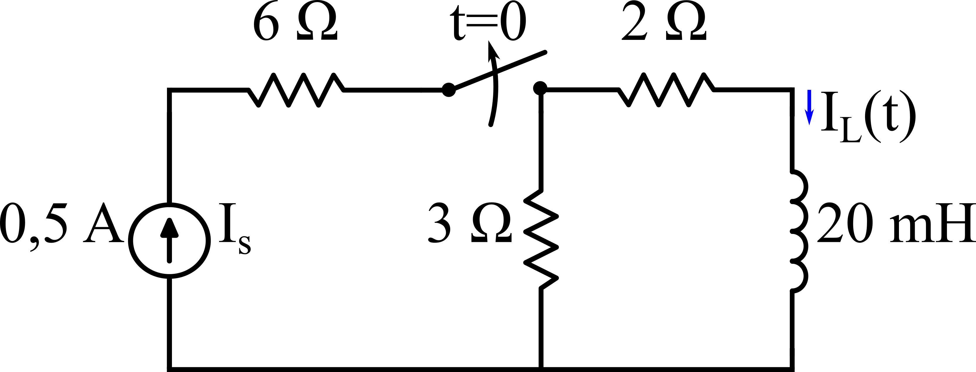 Anahtar t = 0 anında açıldığında devre yukarıdaki gibi olup, seri bağlı 2 Ω'luk ve 3 Ω'luk dirençler ve L = 20 mH'lik bobinden oluşmaktadır. Bu devrenin zaman sabiti msn olmaktadır. Böylelikle iL(t) akımının zamana göre ifadesi