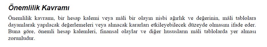 "Bir hesap kalemi veya mâli bir olayın nisbi ağırlık ve değerinin, mâli tablolara dayanılarak yapılacak değerlemeleri veya alınacak kararları etkileyebilecek düzeyde olmasını ifade eder" açıklaması aşağıdaki muhasebenin temel kavramlarından biri ile ifade edilebilir?