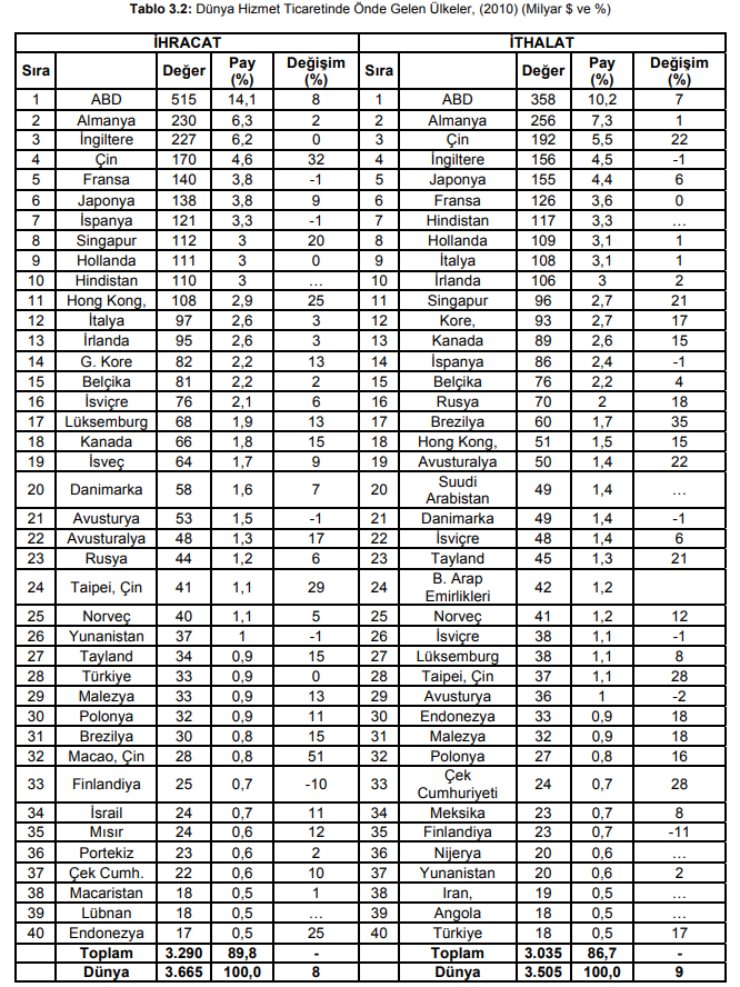 Dünya hizmet ticaretinin ülkeler bazındaki gelişimi ayrıntılı olarak Tablo 3.2’de verilmiştir. ABD 2010 yılında global hizmet ihracatından %14’lük pay alarak 515 milyar dolarlık ihracat ile ülke bazında dünyanın en büyük ihracatçısı olmuştur.