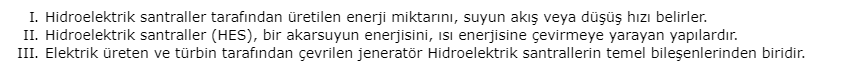 Hidroelektrik santraller tarafından üretilen enerji miktarını, suyun akış veya düşüş hızı belirler. Hidroelektrik santraller (HES), bir akarsuyun enerjisini, ısı enerjisine değil elektrik enerjisine çevirmeye yarayan yapılardır. Elektrik üreten ve türbin tarafından çevrilen jeneratör Hidroelektrik santrallerin temel bileşenlerinden biridir. Dolayısıyla doğru cevap D'dir.