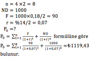 Vadesine 4 yıl kalmış altı ayda bir faiz ödemeli ₺1000 nominal değerli ve %18 kupon faizli tahvilden %14 getiri beklenirse tahvilin değeri ne olur?