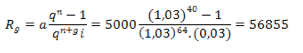 3 ayda bir faiz uygulandığından 1 yılda 4 kez faiz uygulanır. Dolayısıyla n=4x10=40, n+g=64 olarak hesaplanır. Bu değerleri “Geciktirilmiş Anünitelerde Bugünkü Değer” formülünde yerine koyarsak
