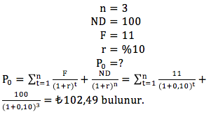15 Ocak 2014 tarihinde ihraç edilen ve vade tarihi 15 Ocak 2021 olan 7 yıl vadeli, ₺100 nominal değerli, yılda bir defa kupon ödemeli tahvilin kupon faiz oranı % 11’dir. Bu tahvili 15 Ocak 2018 tarihinde almayı düşünen bir yatırımcı piyasa faiz oranının (beklenen getiri oranı / iskonto oranı) %10’a düşmesi durumunda tahvili kaç ₺’ye alır?