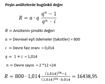 Bir şirket aylık %1,4 faiz oranıyla 2 yıl vadeli kredi çekmiştir. Aylık taksit tutarı 800 liradır ve ilk ödeme hemen yapılacaktır. Buna göre kredinin şimdiki değeri kaç liradır?