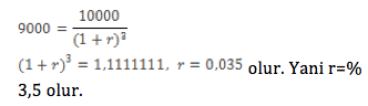 10.000 tl nominal değerli, 3 yıl vadeli kuponsuz bir tahvil piyasadan 9.000 tl'ye satın alınmaktadır. Bu tahvile yatırım yapacak yatırımcıın getiri oranı ne olmalıdır?