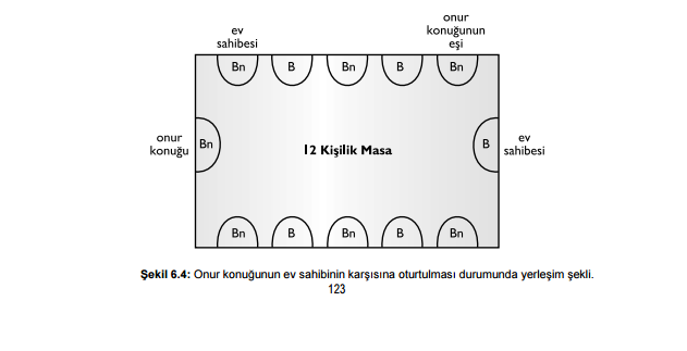 Onur konuğunun (bayan) ev sahibinin karşısına oturtulduğu bir diktörtgen sofra düzeninde, onur konuğunun eşi nereye oturtulmalıdır?