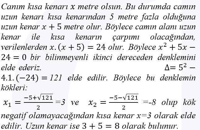 Bir evde alanı 24 m2 olan bir bölgeye dikdörtgen şeklinde cam yapılacaktır. Bu camın uzun kenarı kısa kenarından 5 metre fazla olduğuna göre uzun kenarın uzunluğu kaç metredir?