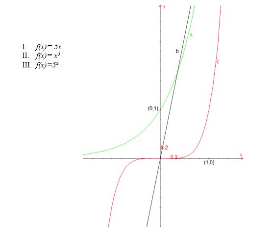 Verilen denklemler eşlenirse I-b, II-c, III-a olarak ifade edilebilir. Yeşil olan ise 5x fonksiyonunun grafiğidir.