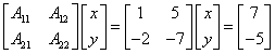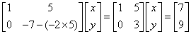 Denklem setinde 2 bilinmeyen bulunduğundan N-1=2-1=1 adet Gauss eleme basamağı vardır. Öncelikle denklem seti matris formunda aşağıdaki şekilde ifade edilebilir: