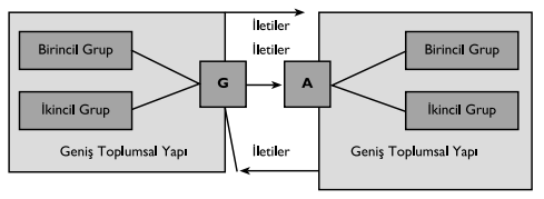 Tıpkı alıcı (A) gibi kaynak (G) da toplumsal bir yapının içerisinde farklı referans gruplarıyla ilişki halindedir. Kaynağın içinde bulunduğu ilişkiler daha farklı bir nitelik sergiler. Ekonomik gruplar tarafından bir tekelden söz edilebilir ve bu tekel durumu alıcının geri bildiriminde daha da belirginleşir. Riley ve Riley’e göre kaynak mesajını aynı sistem içerisindeki öteki kişilerin ve grupların etkinlikleri ve beklentilerine uygun şekilde gönderir. Böylelikle modelin ikinci basamağı da kurulmuş olur. Model incelendiğinde kaynak ile alıcı arasında karşılıklı bir mesaj alışverişi görülür. Dolayısıyla bu model, ilk iletişim araştırmalarının düz, doğrusal ve tek yönlü bir iletişim algılayışından farklıdır. Kaynak ile alıcı arasında basit bir mesaj alışverişinden daha çok bir etkileşim söz konusudur.