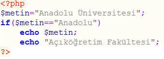 Verilen kodlarda metin isimli bir değişken oluşturulmuş ve değişkenin aldığı değer "Anadolu Üniversitesi" olarak belirlenmiştir. "if" şart ifadesinin içinde metin değişkeninin aldığı değerin "Anadolu" olup olmadığı kontrol edilmektedir. Değişkenin değeri "Anadolu Üniversitesi" olduğu için bu şart sağlanmamaktadır. Şart sağlanmadığı için bu şarta bağlı olan "echo $metin;" komutu çalıştırılmayarak bir sonraki komut satırına geçilecektir. Sonraki komut satırı ise ekrana "Açıköğretim Fakültesi" yazdırmaktadır. Yani doğru yanıt E seçeneği olacaktır.