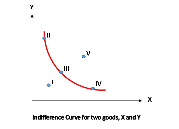 Any point that is located above and to the right of an indifference curve provides a higher level of consumption of each good than the points on that indifference curve. Because of this, point V provides a higher level of utility than the points on the indifference curve. Thus, point V would be preferred to either point II, III or IV. The point that lies below and to the left of the indifference curve (point I), however, provides a lower level of utility. The correct answer is E.