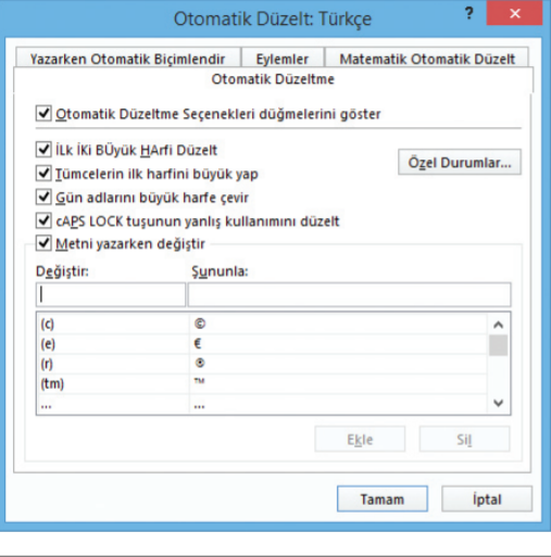 şeklini değiştirebilirsiniz. Otomatik düzeltme seçeneklerini değiştirebilir ya da MS Office