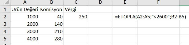 =ETOPLA(A2:A5;"<2600";B2:B5) fonksiyonu, A2:A5 aralığında 2600'den daha az olan verilerin B2:B5 aralığında bulunan değerlerini toplar. Bu da 140+40=180 olarak bulunur.