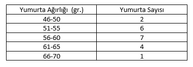 Bir tavuk çiftliğinde rassal olarak seçilen 20 yumurtanın ağırlıkları yukarıdaki tabloda frekans serisi olarak verilmiştir. Bu çiftlikte üretilen yumurtalar için değişim aralığını için aşağıdakilerden hangisi doğrudur?