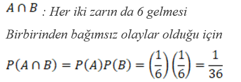 Hilesiz bir zarın iki kez atılması deneyinde her iki atışın da 6 gelmesi olasılığı kaçtır?