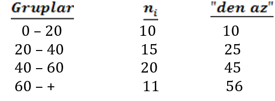 Öncelikle “den az” frekanslar hesaplanarak, n/2 yardımıyla medyan sınıfının