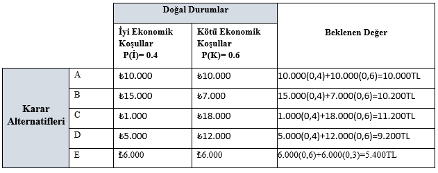 En iyi beklenen değer ölçütünde, j’inci doğal durumun ortaya çıkma olasılığı Pj ile gösterilirse, i’inci karar alternatifinin (Ai) uygulanması durumunda beklenen kazanç/maliyet şu eşitlikle hesaplanır:
