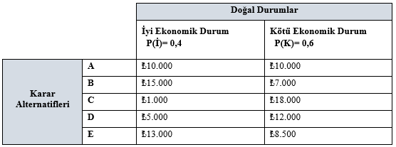 Bir yatırımcı beş farklı hisse senedinden birine yatırım yapmak istemektedir. Karar verici önümüzdeki dönem için ekonominin % 40 olasılıkla iyi durumda, %60 olasılıkla ise kötü durumda olacağını tahmin etmektedir. Yatırımcı beş hisse senedine yapacağı yatırım değerlerinden elde edeceği kazancı tespit etmiştir. Yatırımcının farklı hisse senedi seçenekleri ve doğal durumlar için beklediği kazanç değerleri Türk Lirası olarak yukarıda yer alan tabloda gösterilmiştir. Yatırımcının, en iyi beklenen değer ölçütünü kullanarak vereceği en iyi karar aşağıdakilerden hangisidir?