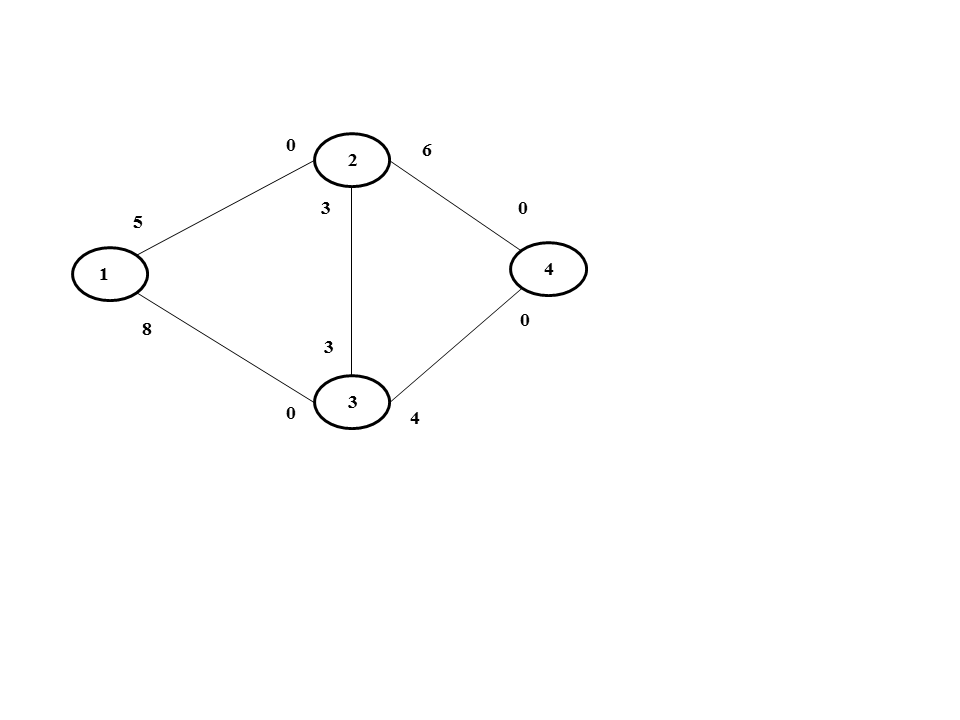 Kaynaktan bitim düğümüne pozitif akış sağlayabilecek yollardan birisi 1-3-2-4 olmaktadır. Bu yoldan gönderilebilecek en yüksek miktar 3 birim olmaktadır. Yol üzerindeki akış kapasiteleri ileri doğru 3 birim azaltılırken geri doğru 3 birim arttırılır. Sonrasında oluşturulan çizge üzerindeki 1-2-4 yolu üzerinden gönderilebilecek en yüksek miktar 3 birim olmaktadır. Sonrasında oluşturulan çizge üzerindeki 1-3-4 yolu üzerinde gönderilebilecek en yüksek miktar 4 birim olmaktadır. Bunun sonucunda kaynaktan bitim düğümüne pozitif akışın olanaklı olduğu yolun bulunmadığı görülür. Bu durumda kaynaktan bitime gönderilebilecek miktar her iterasyon sonunda gönderilen toplam miktar olan 3+3+4=10 birimdir.