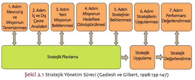 Çeşitli kaynaklar stratejik plan yönetim sürecini farklı sayılarda adımlarla açıklasa da, genel anlamda hepsinin planlama, uygulama ve değerlendirme olmak üzere üç ana bölümü içerdiği söylenebilir. Burada, bu üç ana etabı yedi adımda inceleyen stratejik yönetim sürecine değinilecektir. Bu sürecin adımları sırasıyla, (1) mevcut işi ve misyonu tanımlama, (2) kurumun iç çevresindeki güçlü ve zayıf yanları ile dış çevresindeki fırsatları ve tehditleri değerlendirme, (3) yeni bir misyon belirleme, (4) misyonu stratejik hedeflere aktarma, (5) strateji ve eylem rotasını belirleme, (6) uygulama ve (7) değerlendirme şeklinde sıralanır. İlk beş adım planlama, altıncı adım uygulama ve son adım da değerlendirme aşaması olarak da adlandırılır (S¸ekil 2.1) (Gadiesh ve Gilbert, 1998:139-147).