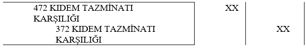 İşletmeler dönem sonu itibariyle, izleyen yıl içinde işten çıkaracağı işçilere ödeyeceği kıdem tazminatını öngörürler. İzleyen dönemde ödenecek kıdem tazminatı tutarı, kısa vadeli bir borçtur. Bu nedenle, öngörülen tutar uzun vadeli borç hesabından kısa vadeli borç hesabına aktarılır. Bu amaçla yapılması gereken günlük defter 472 ve 372 no’lu hesapları içerir.