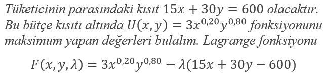 fonksiyonu ile belirlenmiş olsun. Tüketicinin faydasını maksimum yapmak için satın alınacak ve miktarları ne olmalıdır?