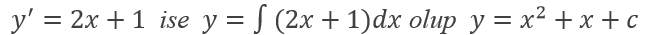 elde edilir. x=0 için y=0 başlangıç değeri uygulanırsa 0=0+0+c eşitliğinden c=0 bulunur. O halde