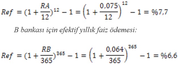 A bankası aylık vade ile yıllık %7,5’lik nominal faiz oranı önermektedir. B Bankası ise günlük vade ile yıllık %6,4’lük nominal faiz oranı önermektedir. A ve B bankaları tarafından ödenecek efektif yıllık faiz ne kadardır?