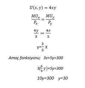 U(x,y)=4xy şeklinde yanlız x ve y mallarını tüketen Ahmet'in fayda fonnksiyonu verilmiştir. Ahmet 1 br. x için 3 TL. ve 1 br. y için 5 TL ödemektedir. Bu iki malı tüketmek için Ahmet'in toplam 300 TL. si bulunmaktadır. Buna göre Ahmet maksimum fayda elde edebilmek için ne kadar y tüketmelidir?