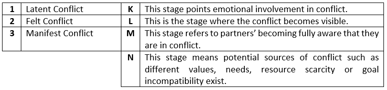 Latent Conflict: The first stage called as “latent conflict” means potential sources of conflict such as different values, needs, resource scarcity or goal incompatibility exist.