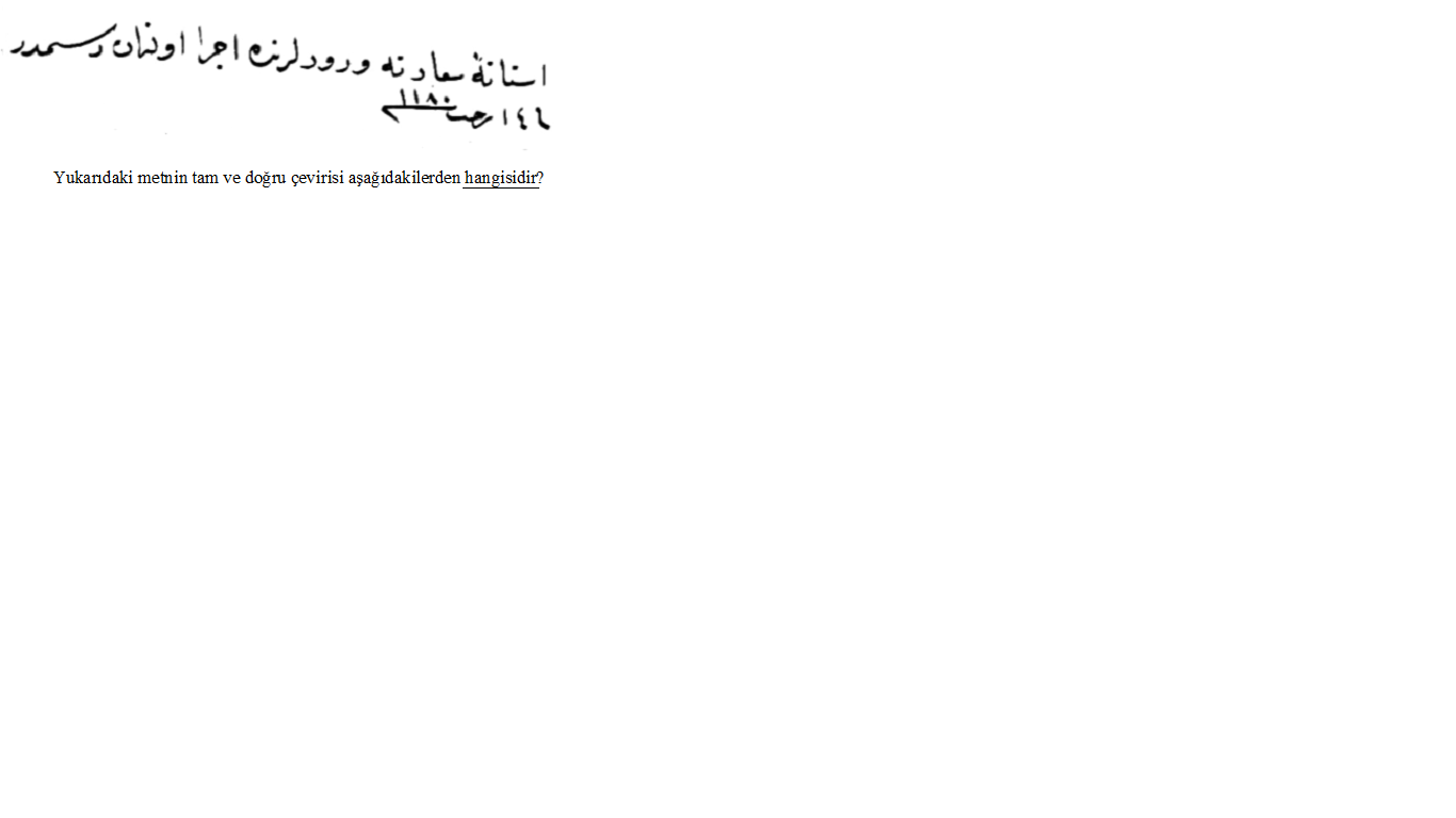 "...Âsitâne-i sa‘âdet’e vürûdlarında icrâ olunan resimdir. Fî 14 Receb sene 1180..." metnin doğru okunuşudur. Doğru cevap B'dir.