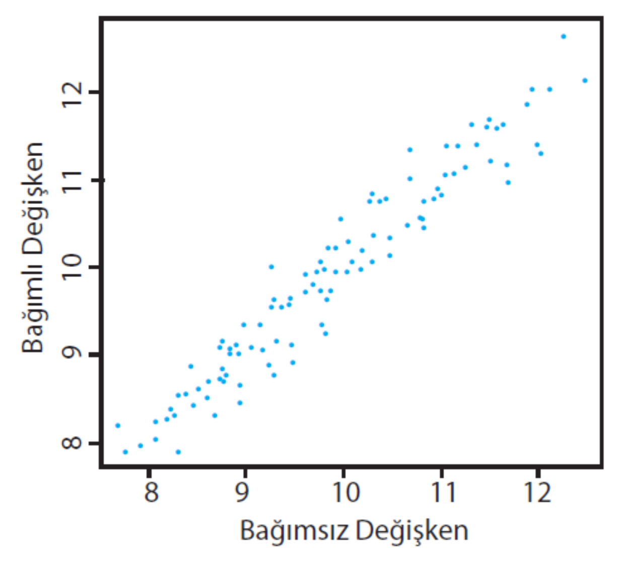 Saçılım grafiğindeki değişkenlerinin dağılımı incelendiğinde biri artarken diğerinin de arttığı görülmektedir. İncelenen iki değişken arasında aynı yönlü (ya da artı yönlü) bir ilişki söz konusudur. Doğru cevap C'dir.