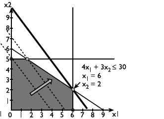 Amaç fonksiyonunu paralel olarak kuzeydoğu yönünde kaydırmaya devam edilirse, amaç fonksiyonunun değeri de sürekli olarak artacaktır. Modelde amacımız tüm kısıtları sağlayan karar değişkenlerinin maksimum değerini bulmak olduğu için, amaç fonksiyonunu uygun çözüm bölgesine temas ettiği en son noktaya kadar kuzeybatı yönünde kaydırılır. Bu noktadaki x1 ve x2 değerleri karar değişkenlerinin optimal değerleridir (x1=6, x2=2). Bu değerleri amaç fonksiyonunda yerine koyduğumuzda 30 değerini elde edilir. Bu değer de optimal çözümdür.