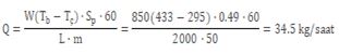 Soruda verilen değerler sırasıyla W= 850 kg, Tb= 160+273= 433 K, Tç= 22+273= 295 K, Sp= 0,49 kj/kg.K, L= 2000 kj/kg ve m= 50 dakika olarak verilmektedir.