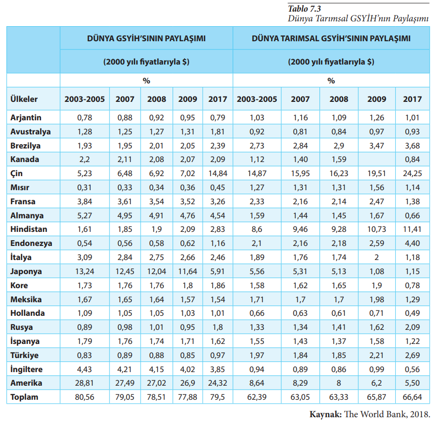Dünyada tarımsal ürünlerden elde edilen GSYİH’nin paylaşımı açısından önemli bir nokta toplam GSYİH’nin az sayıda ülke arasında bölüştürülüyor olmasıdır. Aşağıda Tablo 7.3’de görüleceği gibi dünya GSYİH’nin büyük bölümü 20 ülke tarafından paylaşılmaktadır. 2003-2005 arası dönemde bu ülkeler dünya tarımsal GSYİH’nin yaklaşık %62’sini alırken bu oran 2017 yılında %67’ye yükselmiştir. Bu da diğer ülkelerin dünya GSYİH’den aldıkları payın giderek azaldığını göstermektedir. Doğru cevap A'dır.
