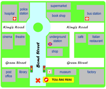 “You are here” noktasından yola çıkarak, cafe’ ye düz git, ilk sağa dön, green Street boyunca ilerle ve sola dön” yönergeleriyle ulaşabiliriz.