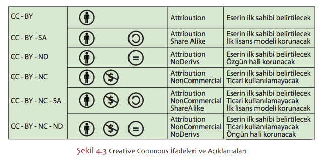 Creative Commons ifadelerinden hangisinin açıklaması "Eserin ilk sahibi belirtilecek, Ticari kullanılamayacak, İlk lisans modeli korunacak" şeklindedir?