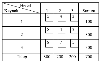 Ulaştırma tablosu verilen problem için aşağıdakilerden hangisi, kuzeybatı köşe yöntemi ile bulunan başlangıç çözümün toplam taşıma maliyetine karşı gelmektedir?
