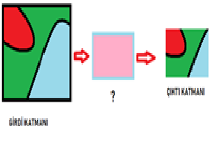 Bir coğrafi analiz sonrası yukarıdaki şekilde ifade edilen Girdi ve Çıktı katmanları gösterilmektedir. Soru işaretinin bulunduğu kısımda Aşağıdaki Analiz Fonksiyonlarından hangisi uygulanmıştır?