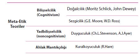 Her ne kadar meta-etik teorilerinin hangileri olduğu, normatif etik teorileriyle aralarındaki sınırın nerede başlayıp nerede bittiği tam açık değilse de genellikle kabul edilen meta-etik teorileri şunlardır: doğalcılık (naturalism), sezgicilik (intuitionism), duyguculuk (emotivism) ve kuralkoyuculuk (prescriptivism)/ahlâk mantıkçılığı.