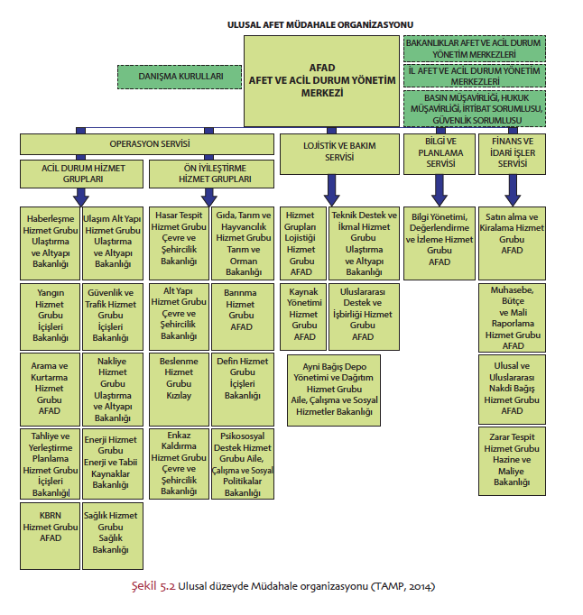 Afete müdahale tüm kamu yönetim alanlarında ilgili kurumlar tarafından yürütülürken, kurumlardaki işleyiş süreçlerinin müdahalenin değişken, tek elden yönlendirme, hızlı karar alma ve etkili koordinasyon gerektiren olağandışı durumuna uygun olarak düzenlenmesi söz konusudur. Ülkemizde kamu yönetimi, afete müdahale süreçlerini her kademede aşağıdakilerden hangisi aracılığıyla koordine etmekte ve yönlendirmektedir?