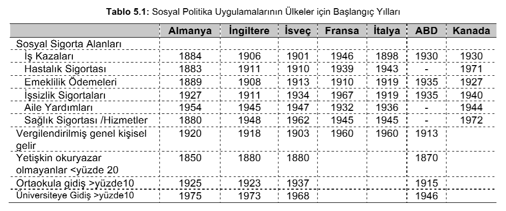 Sosyal politika uygulamalarının ülkeler için başlangıç yıllarına bakıldığında iş kazaları, hastalık sigortası, emeklilik ödemeleri, işsizlik sigortaları, aile yardımları gibi birçok alana bakıldığında her daim ilk sırada yer alan ülke Almanya’dır.