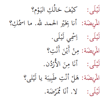 ما مهنَتُكَ ? cümlesi mesleği sormaktadır, haliyle cevabı أنا مُمَرَّضَة (ben hemşireyim) cümlesidir.