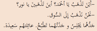 –Nereye gidiyorsun Ahmet? Nereye gidiyorsun Nur? – Biz çarşıya gidiyoruz. İkisinin dedesi (dedeleri) oturuyor, nineleri yemek pişiriyor. Onların ailesi mutludur.